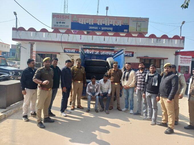 प्रतापगढ़। थाना रानीगंज पुलिस व स्पेशल टीम ने संयुक्त कार्रवाई करते हुए ट्रक से टायर चोरी करने वाले गिरोह का खुलासा किया है। पुलिस ने एक पिकअप बोलोरो वाहन और चोरी किए गए चार ट्रेलर टायर मय रिम के साथ दो शातिर चोरों को गिरफ्तार किया है। यह कार्रवाई थाना रानीगंज क्षेत्र के बीबीपुर/खाखापुर तिराहे के पास की गई।